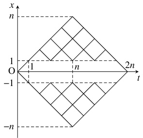 $2n-2$ 本の直線 $x = t-2k$ $(0 \leqq k \leqq n-2),$ $x = -t+2l$ $(2 \leqq l \leqq n)$ が走る碁盤目の $x \geqq 1$ の部分からなる.