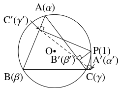 - $\triangle\mathrm{ABC}$ の外接円の周上の点 $\mathrm P$ から直線 $\mathrm{BC},$ $\mathrm{CA},$ $\mathrm{AB}$ に下ろした垂線の足 $\mathrm A'(\alpha '),$ $\mathrm B'(\beta '),$ $\mathrm C'(\gamma ')$ が同一直線上にあることを示したい.