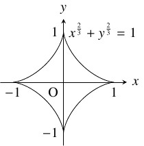 - 曲線 $C:\left\{\begin{array}{l} x = \cos ^3\theta, \\ y = \sin ^3\theta \end{array}\right.\ (-\pi \leqq \theta \leqq \pi)$ が囲む領域の面積 $S$ を求めよ.